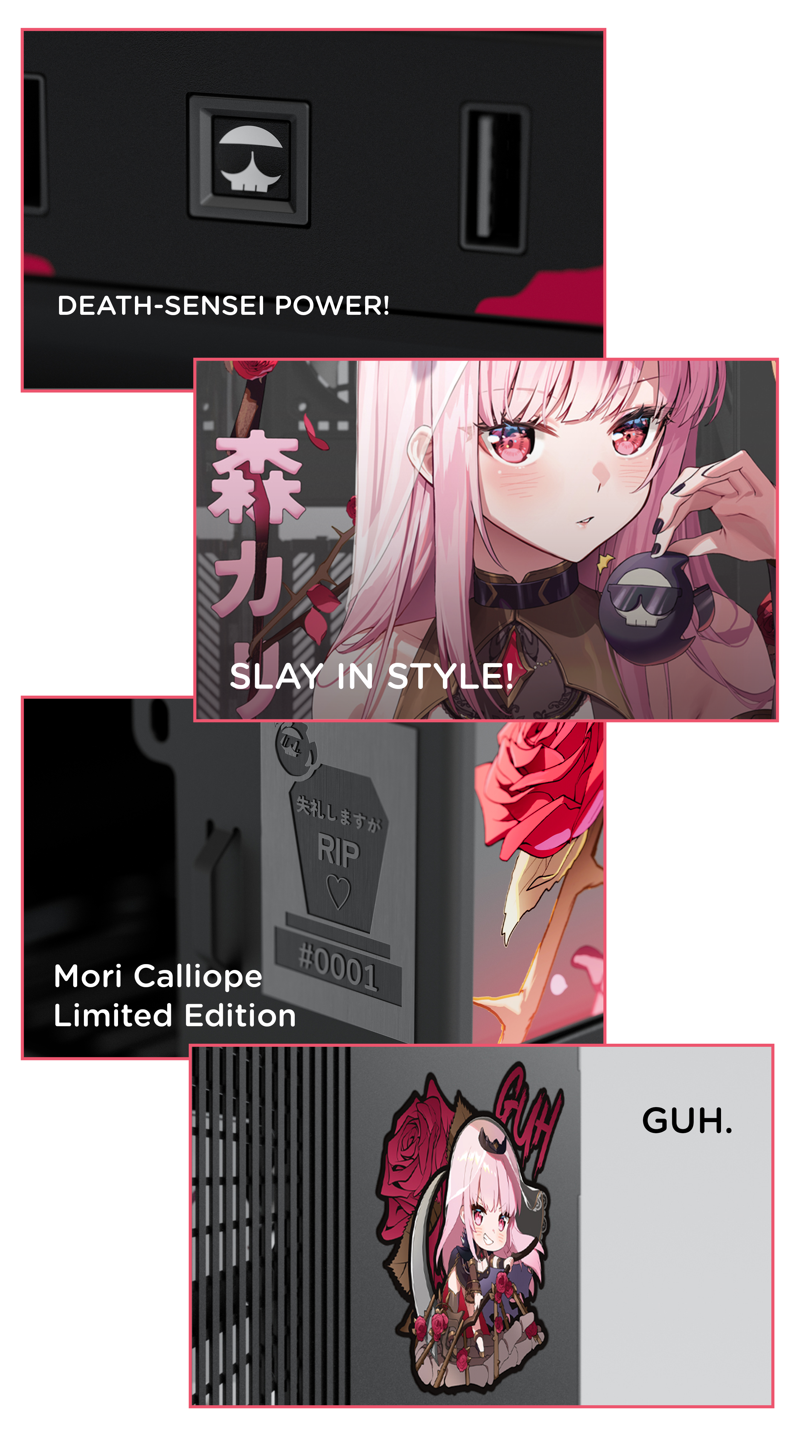 Ready to RIP with your Gaming PC, Dead Beats? The Mori Calliope Limited Edition HYTE Y40 Case and Accessories Bundle now comes as a jam-packed, killer-performance PC that's approved by the rockstar shinigami herself. Claim dibs and collect your one-of-a-kind Mori Calliope RDY offered in extremely limited quanities by hitting that 'Notify Me' button quick! GUH.