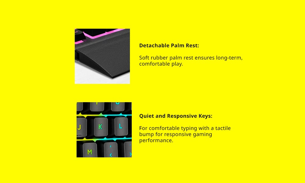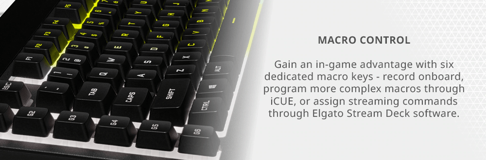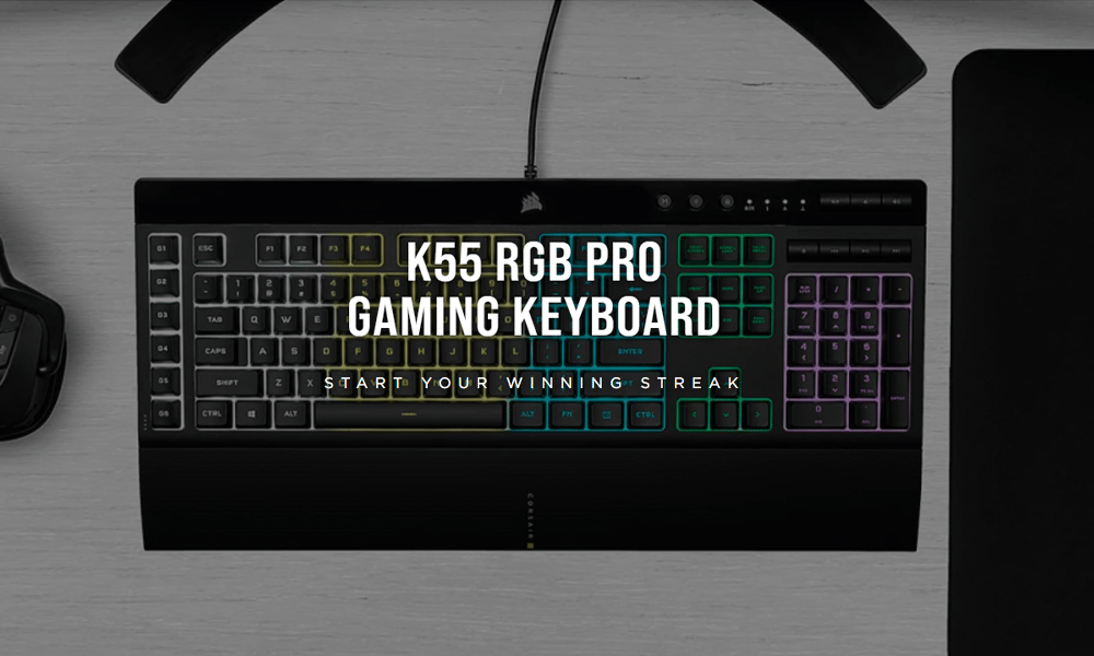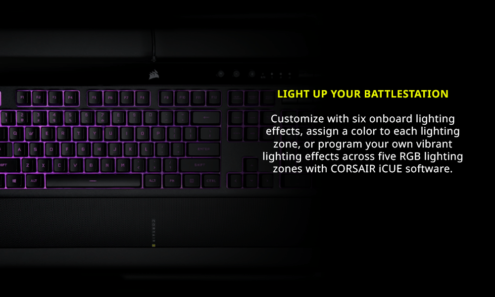 The CORSAIR K55 RGB PRO Gaming Keyboard lights up your desktop with five-zone dynamic RGB backlighting and powers up your gameplay with six dedicated macro keys.